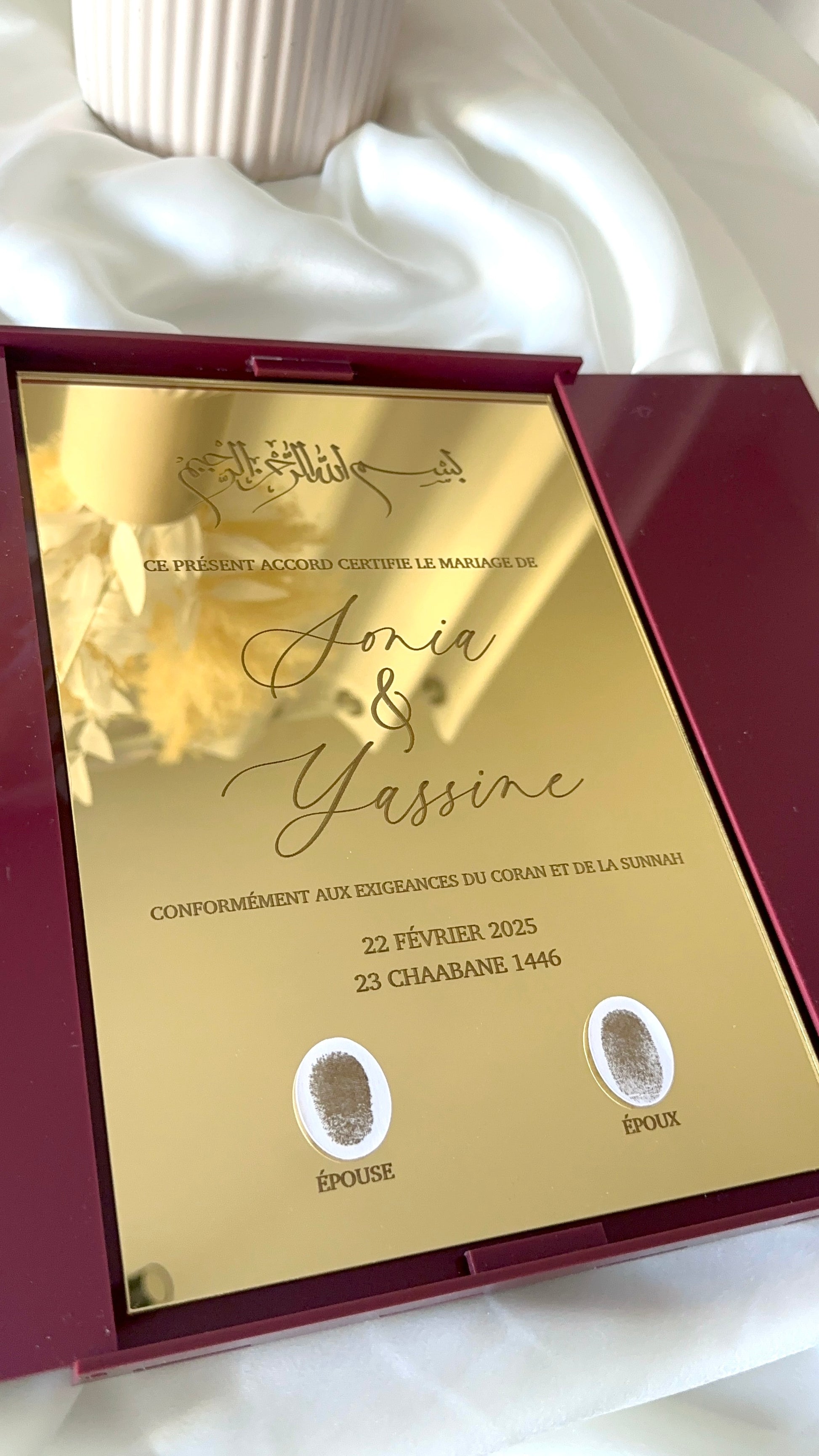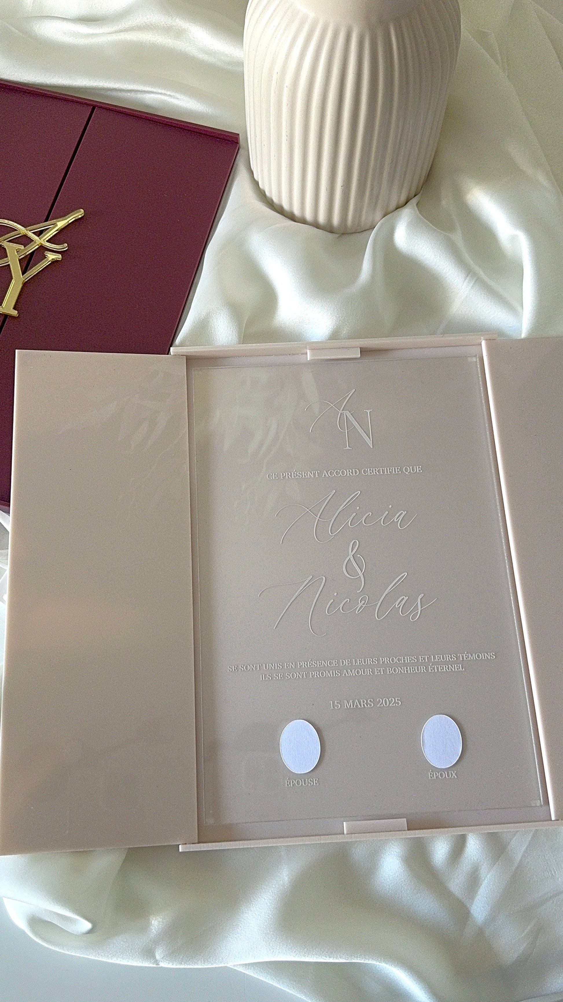 Certificat de mariage en plexi élégant et personnalisé. Gravure du prénom, date et texte sur plexiglass givré ou coloré. Idéal pour un souvenir unique et raffiné. Fabrication artisanale et sur-mesure ✨